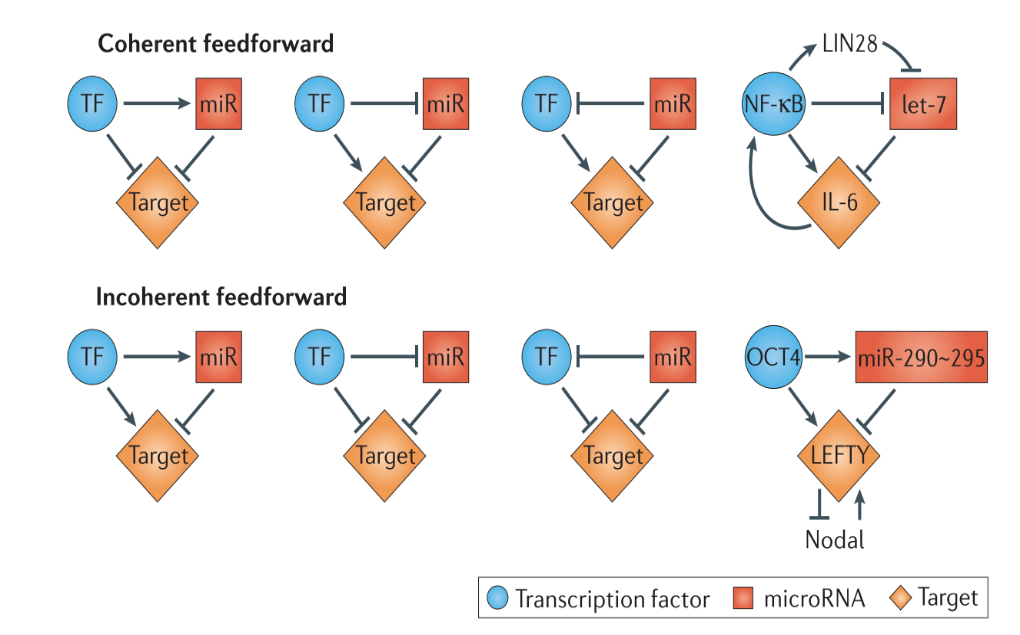 In transcription factor (TF)-miRNA feed-forward loops, TF and miRNA co-regulate the target genes. Specifically, feed-forward loops are classified into coherent and incoherent loops as illustrated in the figure below from Bracken, et al. 2016.
